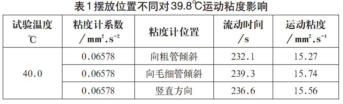 由表1可以看出,粘度計垂直位置的變化使得試樣的測定 結(jié)果不同。粘度計向粗管傾斜,實驗結(jié)果偏小;