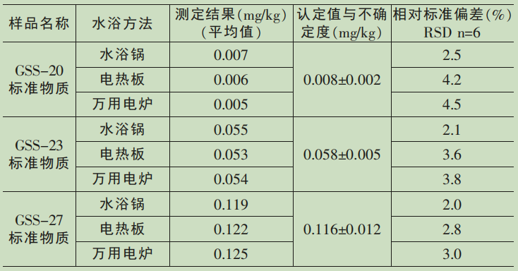 上海昌吉通過對汞不同含量水平的三種標(biāo)準(zhǔn)土壤樣品測試,如表1所示,三種水浴消解方式中,汞高含量水平和中含量水平的標(biāo)準(zhǔn)土壤樣品測定結(jié)果相對穩(wěn)定,三種方法測定結(jié)果均在認(rèn)定值的不確定度范圍內(nèi),而低含量水平的標(biāo)準(zhǔn)土壤樣品測定結(jié)果則出現(xiàn)了一定偏差, 其中萬用電爐水浴方法的測定結(jié)果低于認(rèn)定值的不確定度范圍,電熱板水浴方法測定結(jié)果剛達(dá)為認(rèn)定值不確定度范圍,而水浴鍋法測定結(jié)果最好,在認(rèn)定值與不確定度范圍內(nèi),且三種水浴方法中,水浴鍋法的相對標(biāo)準(zhǔn)偏差最小,為2.0%~2.5%,說明水浴鍋法最穩(wěn)定。從實(shí)驗(yàn)結(jié)果可以看出,在水浴鍋中消解的土壤樣品受熱更均勻穩(wěn)定,消解得更完全。