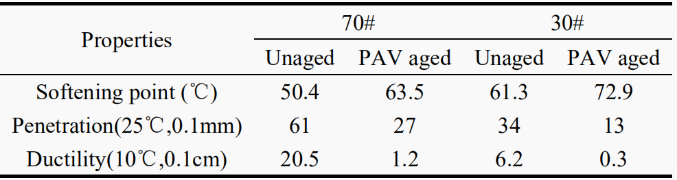 本文上海昌吉地質儀器有限公司采用PAV老化試驗對70#基質瀝青以及30#基質瀝青進行長期老化,PAV長期老化試驗前應首先對瀝青采用旋轉薄膜烘箱對其進行短期老化。短期老化試驗條件為旋轉烘箱在163℃下保持85min;PAV長期老化試驗為在100℃下保持20小時,大氣壓保持在2.1Mpa。根據規范《公路工程瀝青及瀝青混合料試驗規程》(JTGE20-2011)分別對老化前后瀝青進行軟化點、針入度與延度測試,其性能如表1所示。